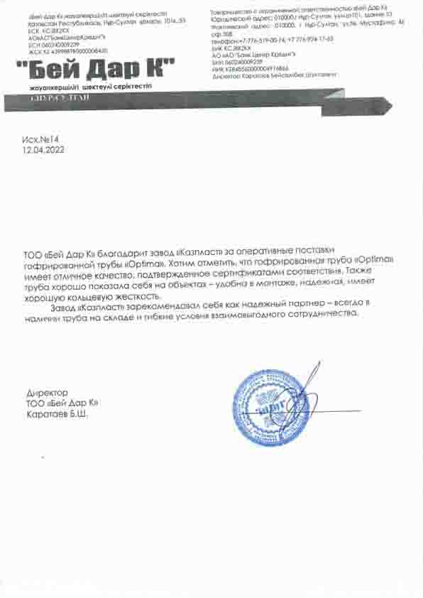 ТОО «Бей Дар К» благодарит завод «Казпласт» за оперативные поставки гофрированной трубы «Optima». Хотим отметить, что гофрированная труба «Optima» имеет отличное качество, подтвержденное сертификатами соответствия. Также труба хорошо показала себя на объектах — удобная в монтаже, надежная, имеет хорошую кольцевую жесткость.